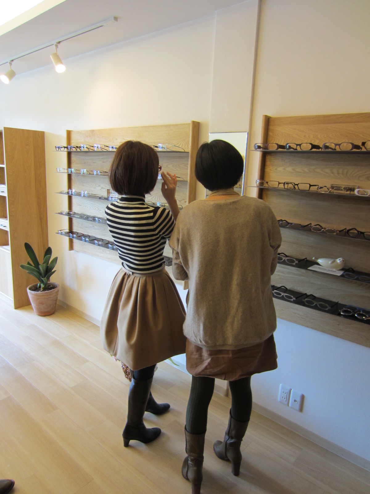 店名にもフィンランド語を用いたように、北欧のライフスタイルに共鳴する部分が多くあり、眼鏡をご覧いただく中で、空間としてのあたたかさや、柔らかい雰囲気だけではない芯の通った凛とした部分というものを表現できればと思っています。 木を多く使用した優しげな木目のインテリアが醸すゆったりとした雰囲気の中、じっくりとお選びいただけるよう空間作りにこだわりました。 ![]() ナラの木を使用した什器は時間の経過とともに美しく色を変え、アイアンの棚は眼鏡の色がより美しく映え、思わず手に取ってみたくなるような趣きがあります。 ![]() 無骨な木とチェーンの組合わせが特徴のペンダントライトも素朴さ温かさの中に甘すぎないかっこよさを演出できればと思いセレクトしました。 ![]() その他、生地から透過した光の美しさが昼間と夜で表情を変えるスタンドライトや、やわらかな表情が愛くるしい Lisa Larson の陶器の置物、季節の花々などで遊び心をプラスし、ご来店いただいた皆様の日常の中で、少しでも Special で幸せな時間を過ごしていただける空間になればと考えています。 ![]() 店舗奥には測定室を構え、イージーチェアでリラックスした時間をお過ごしいただけます。 ブルーノマットソンが1934年にデザインした Eva chair は体をすっぽり包み込むような掛け心地の良さがゆったりとした気分にさせてくれます。 眼鏡を選ばれた後に、ゆっくりとお客様と会話ができればとの思いからこのスペースを作りました。